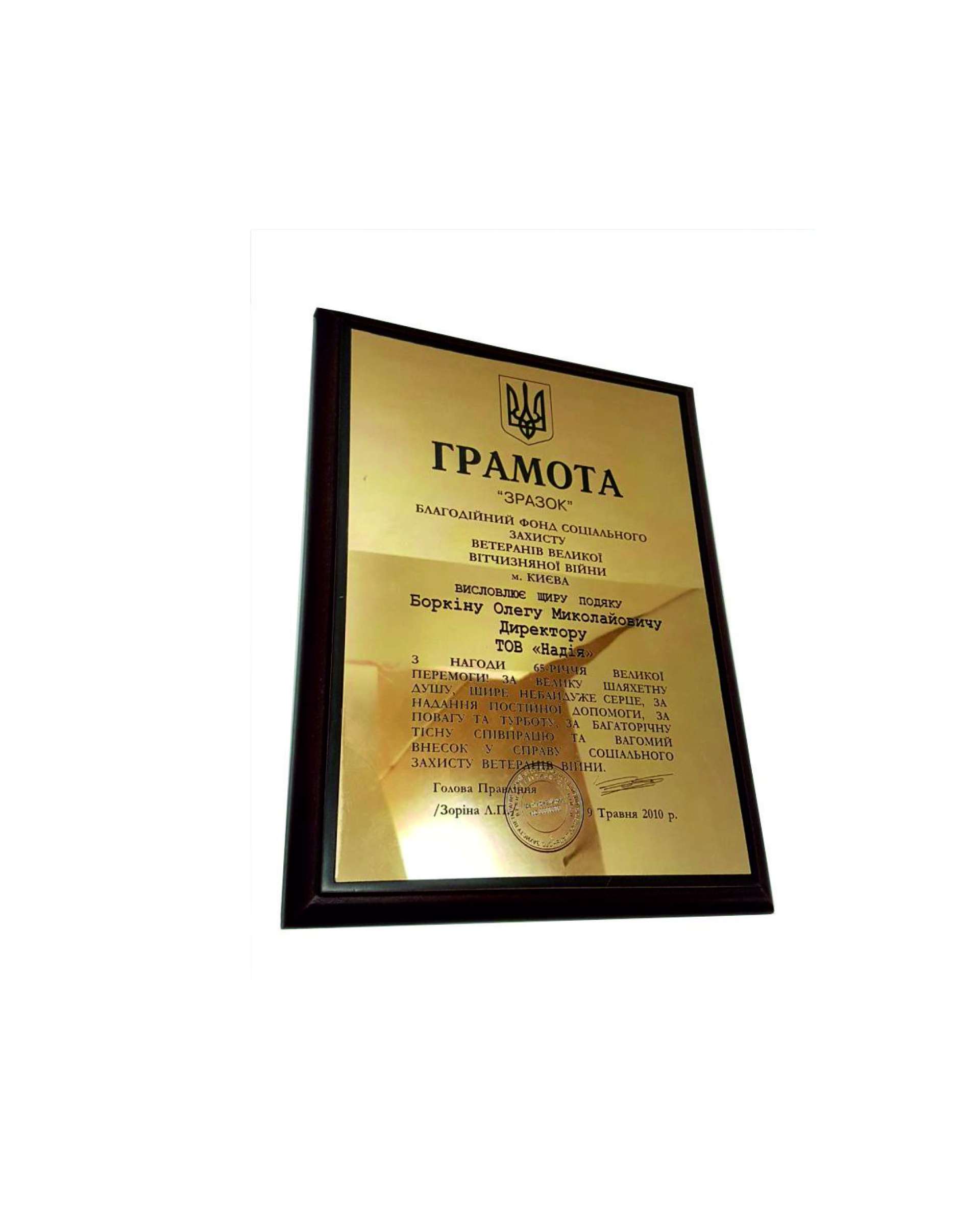 Грамота, диплом на золотистом пластике с деревянной подложкой в Харькове.